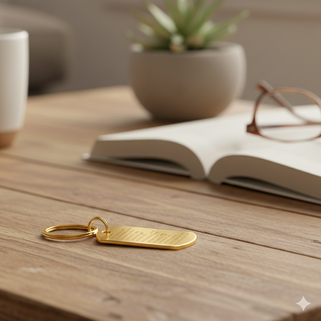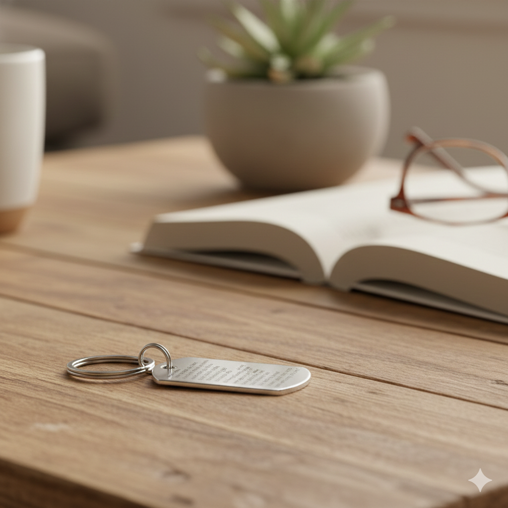Carry your most meaningful melodies with you. This custom engraved keychain features a military-style tag crafted to showcase lyrics that resonate with your story. Select the words that matter most—whether they inspire, comfort, or celebrate a cherished moment—and we'll engrave them with precision onto the premium keychain. A sophisticated accessory that transforms personal sentiment into everyday elegance, perfect for music lovers who wear their hearts on their keys. You can even engrave the back side with a personalized message.